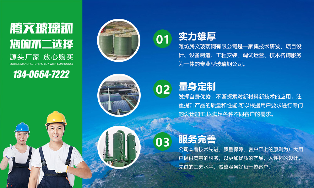 濰坊騰文玻璃鋼有限公司是一家集技術研發、項目設計、設備制造、工程安裝、調試運營、技術咨詢服務為一體的專業型玻璃鋼公司